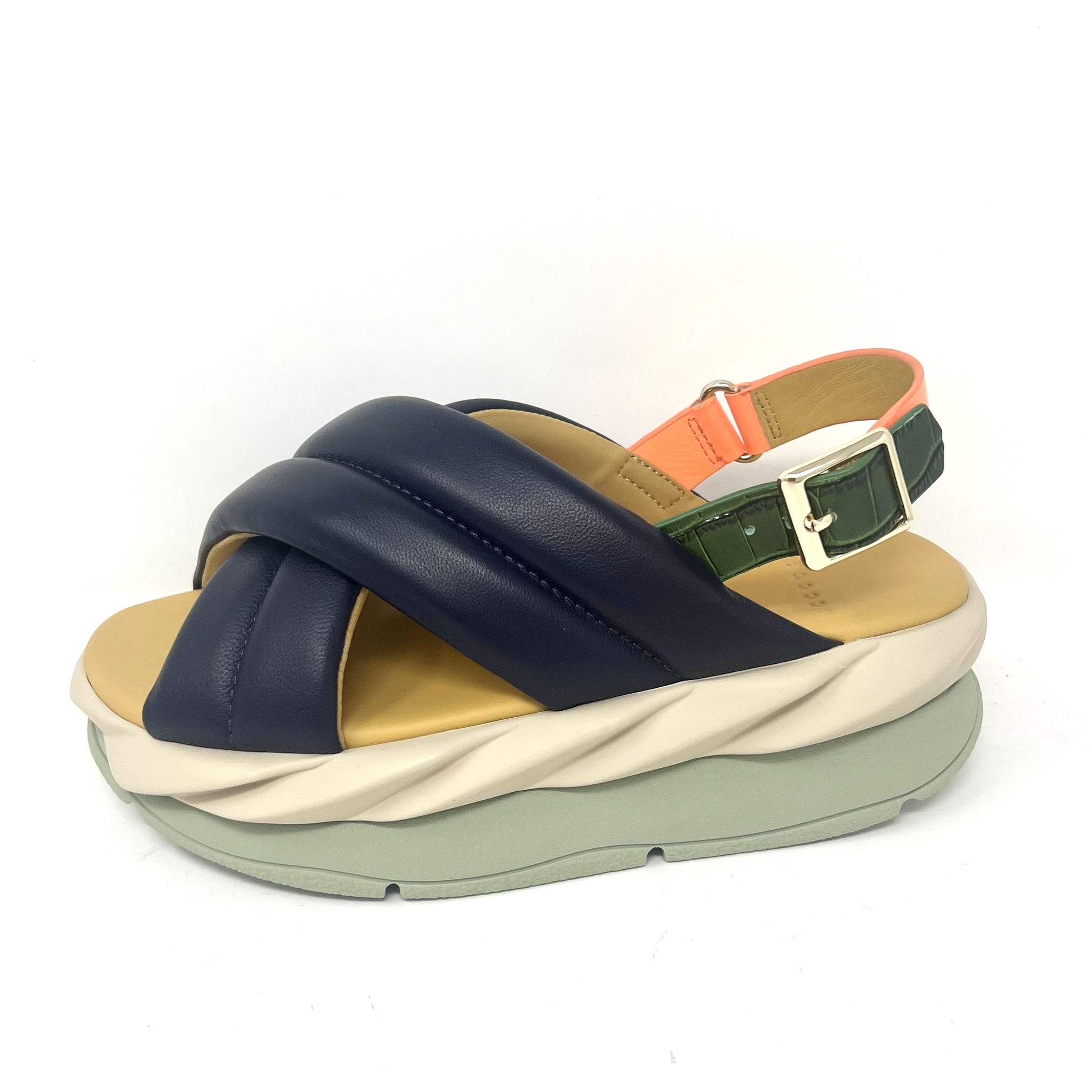 Sandalia creuada pell blava i plataforma. Tancament amb sivella.